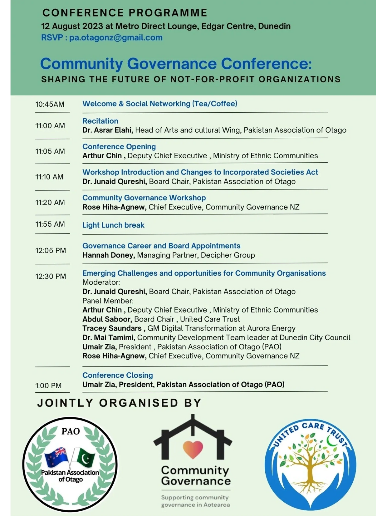 We are excited to invite you to the Community Governance Conference, a collaborative effort by the Pakistan Association of Otago, Community Governance New Zealand, and United Care Trust. This conference serves as a dynamic platform that brings together passionate individuals dedicated to enhancing the governance practices of Not-for-Profit organizations.